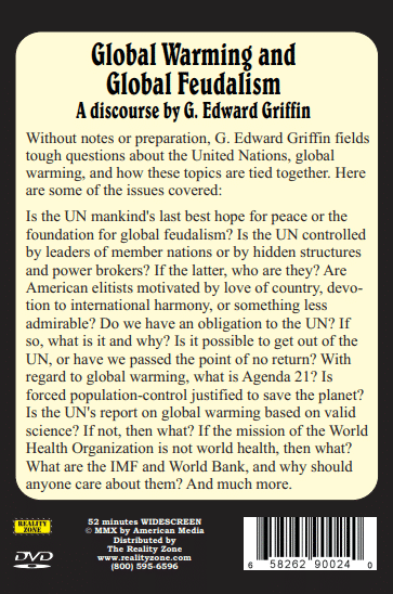 A discourse by G. Edward Griffin Without notes or preparation, G. Edward Griffin fields tough questions about the United Nations, global warming, and how these topics are tied together. Here are some of the issues covered: Is the UN mankind's last best hope for peace or the foundation for global feudalism? Is the UN controlled by leaders of member nations or by hidden structures and power brokers? If the latter, who are they? Are American elitists motivated by love of country, devotion to international harmony, or something less admirable? Do we have an obligation to the UN? If so, what is it and why? Is it possible to get out of the UN, or have we passed the point of no return? With regard to global warming, what is Agenda 21? Is forced population-control justified to save the planet? Is the UN's report on global warming based on valid science? If not, then what? If the mission of the World Health Organization is not world health, then what? What are the IMF and World Bank, and why should anyone care about them? What is the Freedom Force strategy for reversing the trend toward global feudalism?