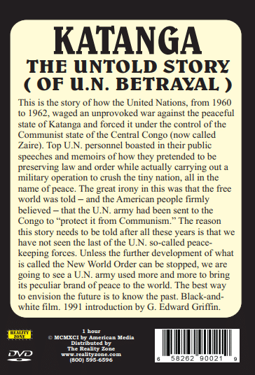 This is the story of how the U. N., from 1960 to 1962, waged an unprovoked war against the peaceful state of Katanga and forced it under the control of the Communist state of the Central Congo (now called Zaire). Top U.N. personnel boasted in their public speeches and memoirs of how they pretended to be preserving law and order while actually carrying out a military operation to crush the tiny nation, all in the name of peace. The great irony in this was that the free world was told – and the American people firmly believed – that the U.N. army had been sent to the Congo to “protect it from Communism.” The reason this story needs to be told after all these years is that we have not seen the last of the U.N. so-called peace-keeping forces. Unless the further development of what is called the New World Order can be stopped, we are going to see a U.N. army used more and more to bring its peculiar brand of peace to the world. The best way to envision the future is to know the past. Black-and-white film. 1991 introduction by G. Edward Griffin. Originally released as a VHS tape, this program has been re-mastered in DVD format.