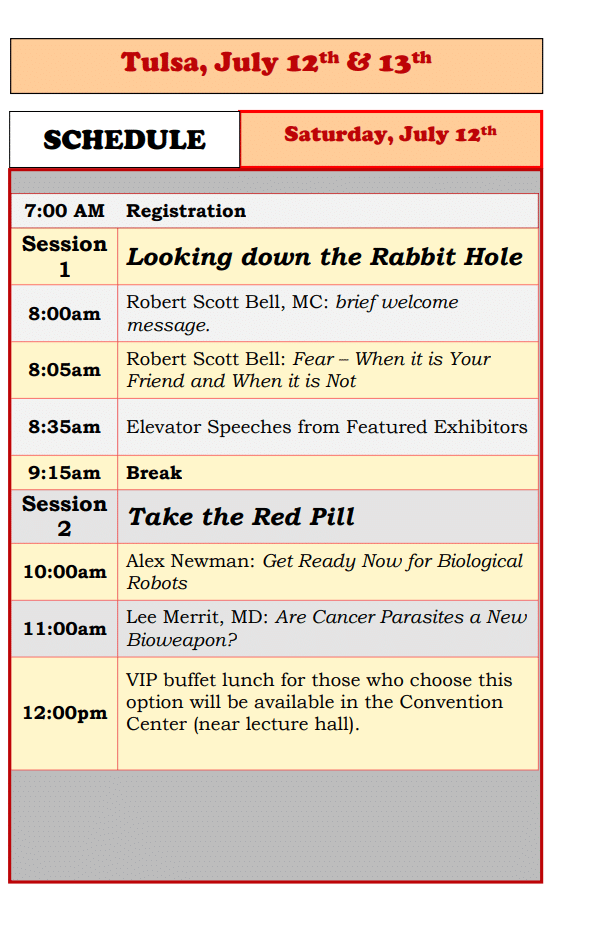 Most of us have “taken the red pill” at one time or another, which means we have changed our views about something incredibly important in our lives. That could not have happened without access to information that often is said to be controversial. That is why Red Pill Expo does not attempt to avoid controversy or censor any ideas advanced by speakers. Tolerance, however, must not be mistaken for acceptance. Please be aware that the views expressed by attendees, exhibitors, or speakers do not necessarily reflect the views of the Expo management or Reality Zone. Our job is to provide a platform for alternate views of reality. After that, it is up to each of us to decide based on our own experience and judgment.